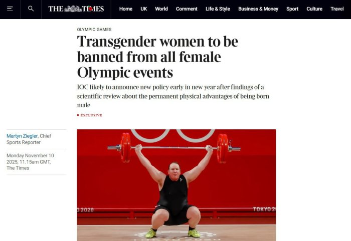 Как сообщает главный спортивный репортер газеты Зиглер, решение будет объявлено после анализа научных данных о необратимых физических преимуществах спортсменов, рожденных мужчинами.