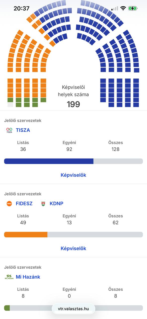 По партийным спискам Tisza тоже вышла вперед, хотя из-за особенностей системы пока получает меньше мандатов, чем Fidesz, несмотря на перевес более чем на 4 п.п. по голосам.