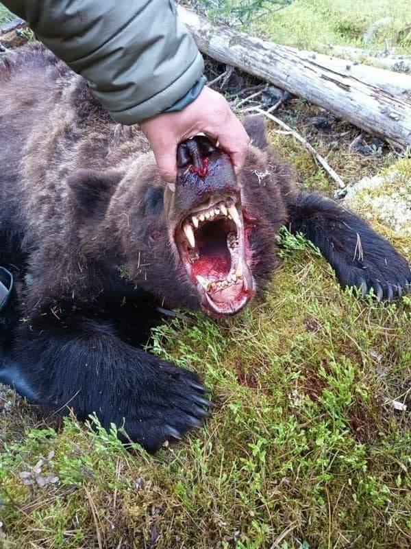 Медведь стоял над обезображенным трупом и в какой-то момент переключил внимание на мужчин. Один из них притворился мертвым и спасся, а второй пошел на медведя с ножом и смог ранить, но хищник травмировал его.