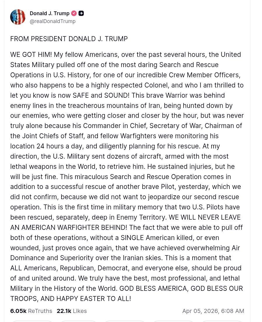 ▪️По его словам, американские военные провели "одну из самых дерзких поисково-спасательных операций в истории США".