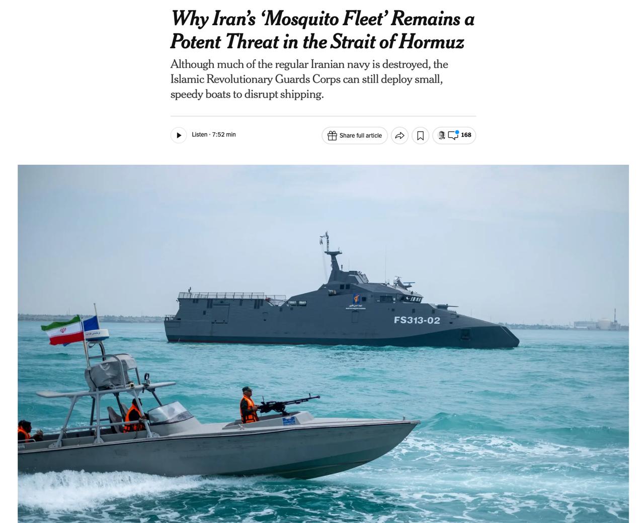 По оценке военных США, более 90% кораблей регулярного флота Ирана были уничтожены. При этом часть катеров КСИР также потеряна, но их общее количество остаётся значительным – от сотен до тысяч единиц. Точные данные отсутствуют.