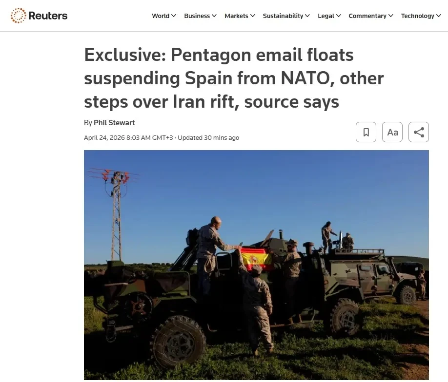 «Внутренний электронный документ Пентагона описывает варианты наказания союзников по НАТО, которые, как считается, не поддержали операции США в войне с Ираном, включая приостановку членства Испании в альянсе», — сообщает агентство.