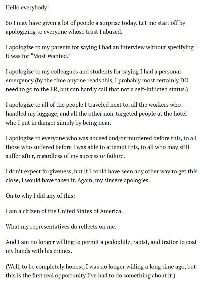 Я приношу извинения всем, кто подвергся насилию и/или был убит до этого, всем тем, кто пострадал до того, как я смог предпринять эту попытку, всем, кто всё ещё может страдать после, независимо от моего успеха или неудачи.