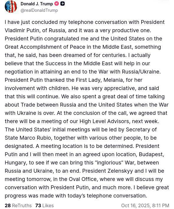 «Я только что завершил телефонный разговор с президентом России Владимиром Путиным, и он был очень продуктивным. Президент Путин поздравил меня и Соединённые Штаты с великим достижением — Миром на Ближнем Востоке, о котором, как он сказал, мечтали на протяжении веков. Я действительно верю, что успех на Ближнем Востоке поможет нам в переговорах по достижению конца войны между Россией и Украиной.