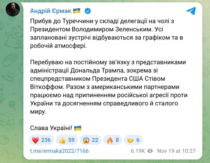 Глава ОП пишет, что проводит встречи и находится в постоянном контакте с Белым домом, в частности, Уиткоффом.