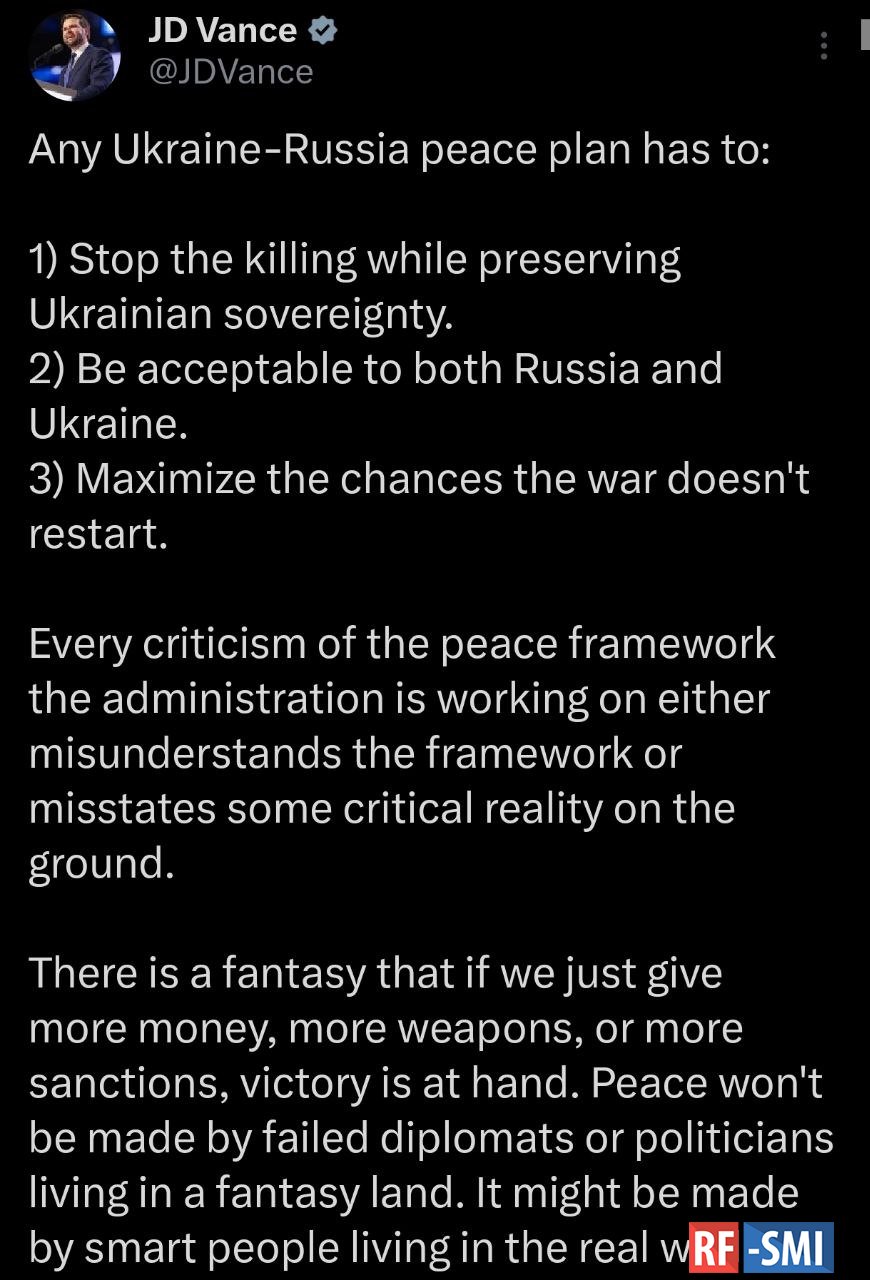 ▪️Критики мирного соглашения либо неверно его понимают, либо искажают критические реалии, заявил Вэнс в ответ на мысли обозревателя The Times Фергюсона.
