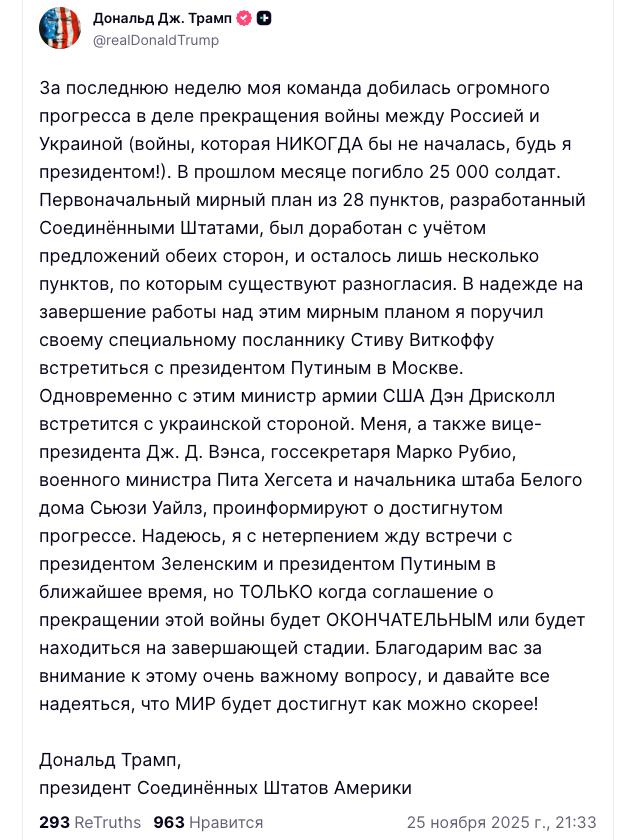 «В надежде на завершение работы над этим мирным планом я поручил своему специальному посланнику Стиву Уиткоффу встретиться с президентом Путиным в Москве. Одновременно с этим министр армии США Дэн Дрисколл встретится с украинской стороной (…)