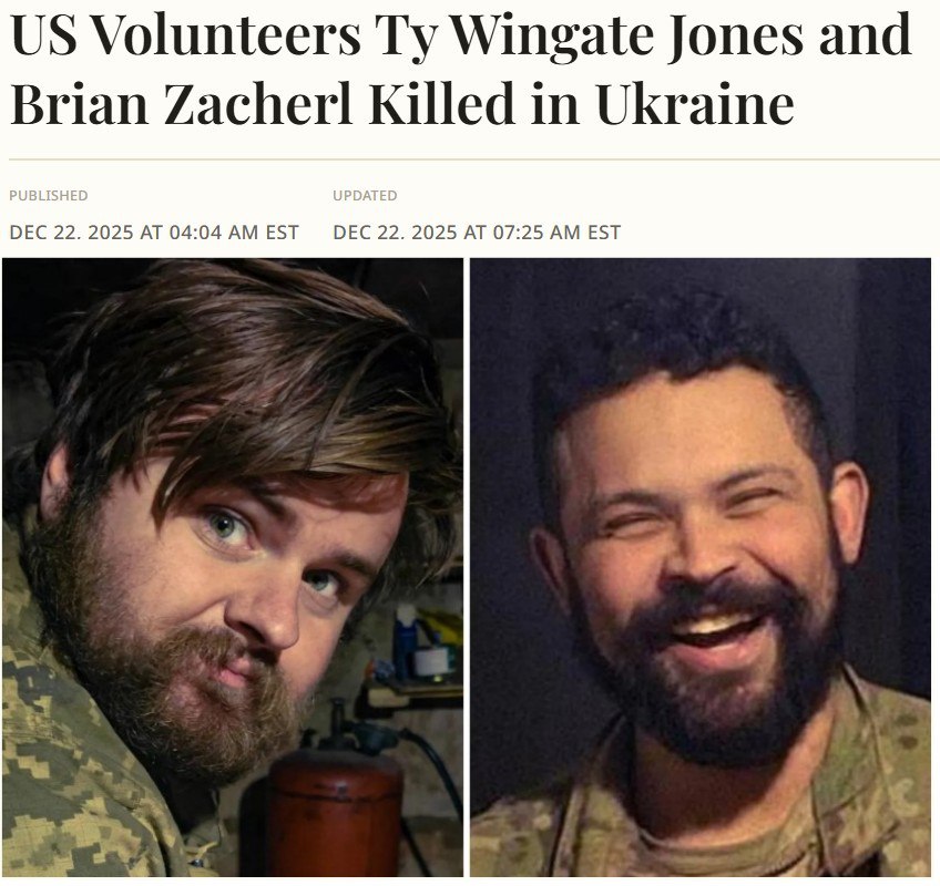 Издание сообщает, что погибшие в начале декабря Тай Уингейт Джонс и Брайан Зачерл служили в «Интернациональном легионе» под командованием ГУР.