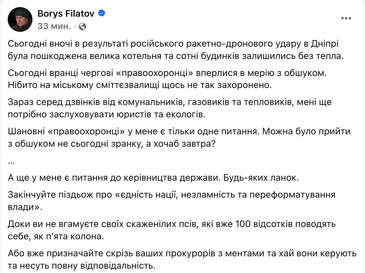 «Сегодня утром очередные “правоохранители” ворвались в мэрию с обыском. Якобы на городском мусорном полигоне что-то не так захоронено», - написал мэр города Борис Филатов.