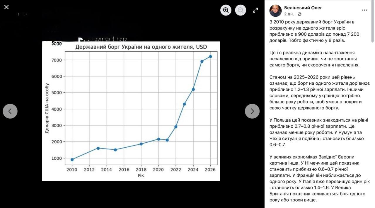 "Каждый украинец должен по $7200": госдолг Украины на одного жителя вырос с 2010 года почти в 8 раз, — экономист Белинский
