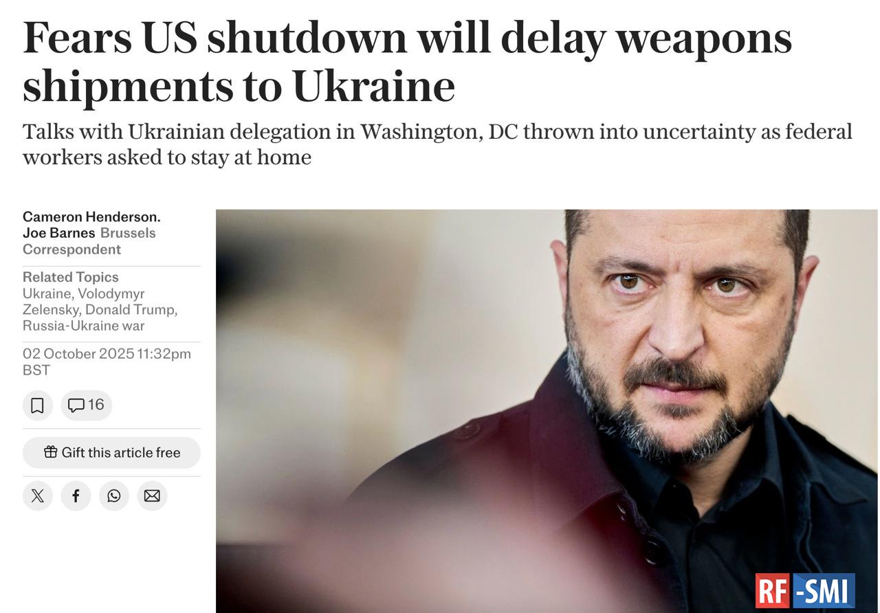 Как сообщил The Telegraph источник в украинском правительстве, дискуссии о военной поддержке Киева оказались заморожены после американского шатдауна 1 октября.