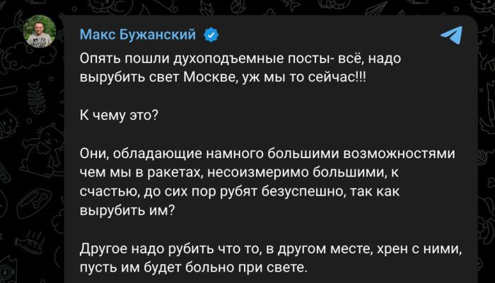 Они, обладающие намного большими возможностями чем мы в ракетах, несоизмеримо большими, к счастью, до сих пор рубят безуспешно, так как вырубить им?» - написал «слуга народа» Макс Бужанский, заявив, что нужно бить по другим объектам.