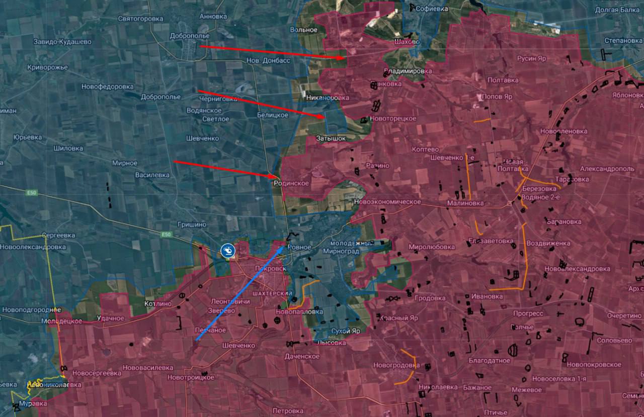 Поэтому атаки сторон на этом участке напоминают символ инь/янь ВС РФ давят через Покровск и оборонятют Родинское. ВСУ - наоборот.
